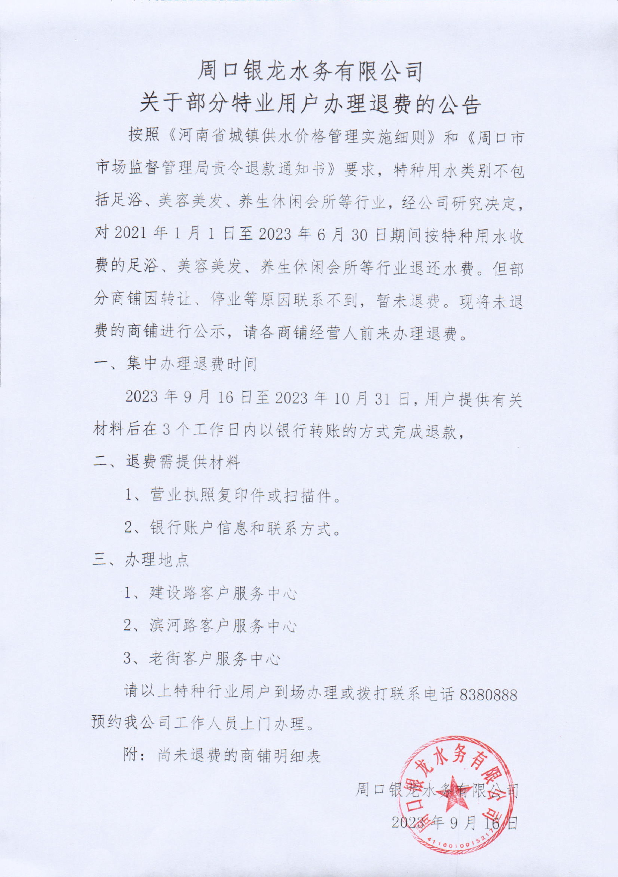 周口銀龍水務(wù)有限公司關(guān)于部分特業(yè)用戶辦理退費的公告按照《河南省城鎮(zhèn)供水價格管理實施細(xì)則》和《周口市市場監(jiān)督管理局責(zé)令退款通知書》要求,特種用水類別不包括足浴、美容美發(fā)、養(yǎng)生休閑會所等行業(yè),經(jīng)公司研究決定...